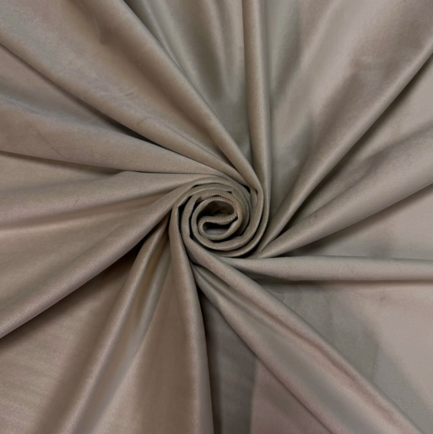 Бежевый бархат — одна из самых востребованных тканей для создания элегантных интерьерных решений. Ткань имеет короткий ворс, мягкую фактуру и отлично драпируется, что делает её идеальной для пошива штор, декоративного текстиля и интерьерного оформления.
