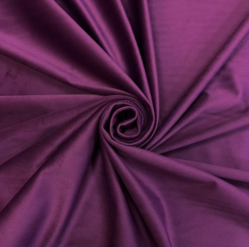 Фиолетовый бархат — одна из самых востребованных тканей для создания светлых, элегантных интерьерных решений. Ткань имеет короткий ворс, мягкую фактуру и отлично драпируется, что делает её идеальной для пошива штор, декоративного текстиля и интерьерного оформления.