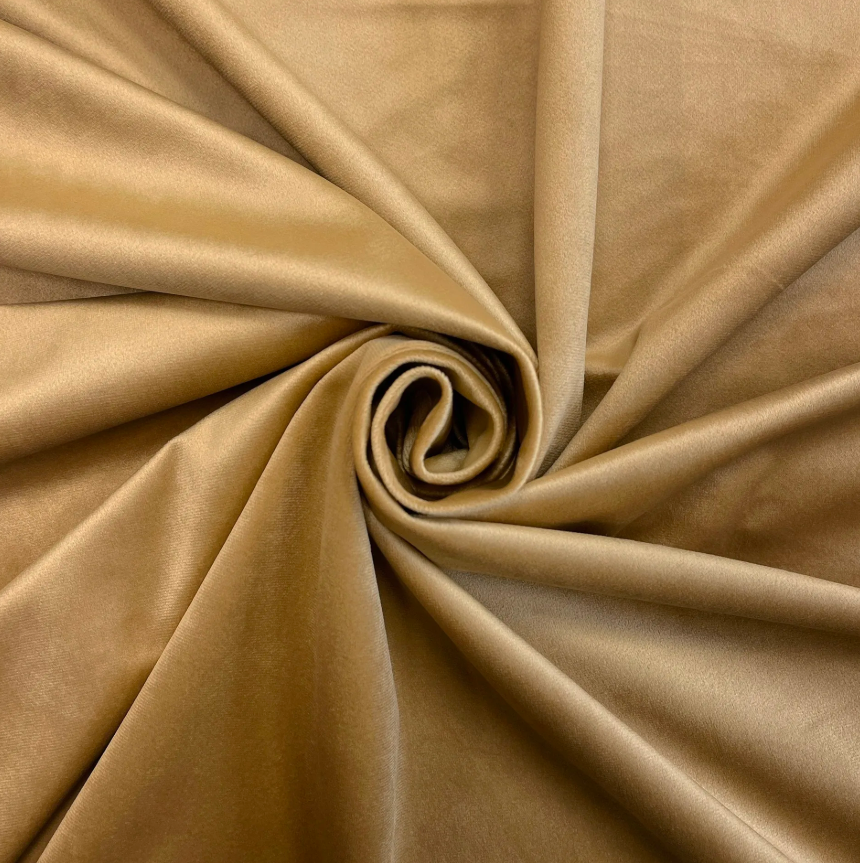 Золотой бархат — одна из самых востребованных тканей для создания светлых, элегантных интерьерных решений. Ткань имеет короткий ворс, мягкую фактуру и отлично драпируется, что делает её идеальной для пошива штор, декоративного текстиля и интерьерного оформления.
