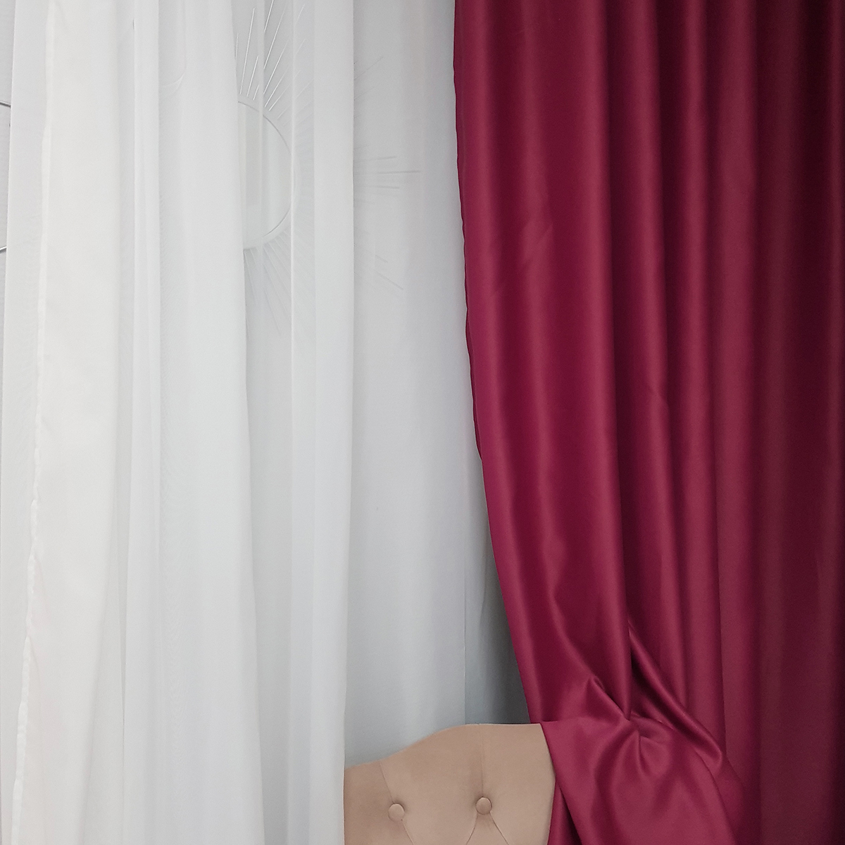 Шторы выполнены из трехслойной ткани блэкаут, светонепроницаемость 80%. Благодаря многослойной структуре, блэкаут задерживает посторонние звуки и шум. Материал штор двухсторонний, гладкий. Шторы blackout светоустойчивые, не выгорают и не линяют, просты в уходе.